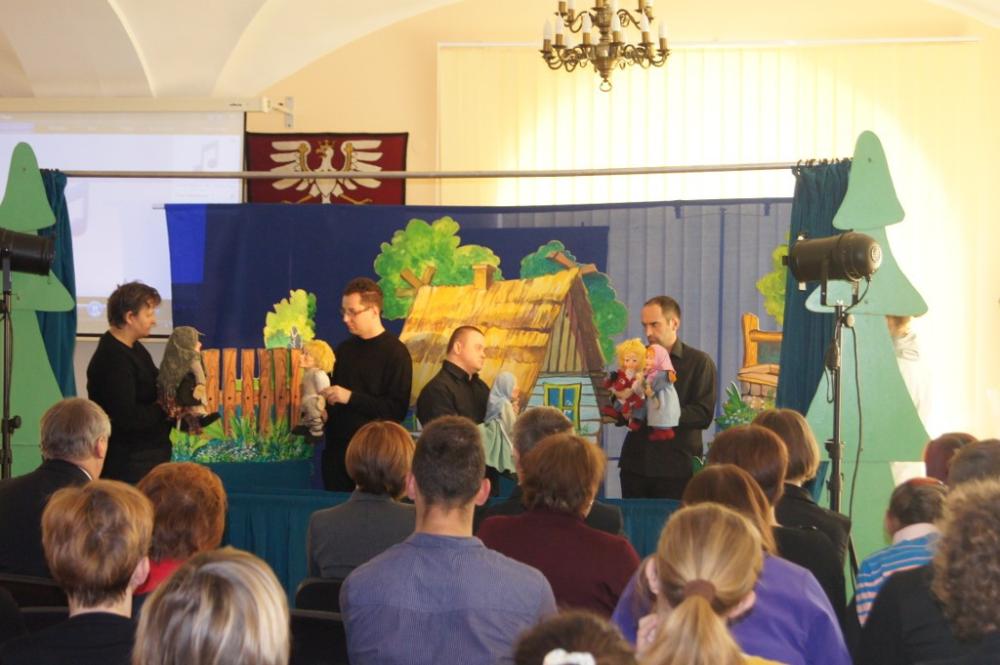 Teatr integracyjny Nowi-Gotowi - osoby niepełnosprawne, uczestnicy Warsztatów Terapii Zajęciowej przy Stowarzyszeniu ,,Remedium'' w Tymbarku przedstawili sztukę, teatrzyk lalkowy ,,Kwiat paproci''.