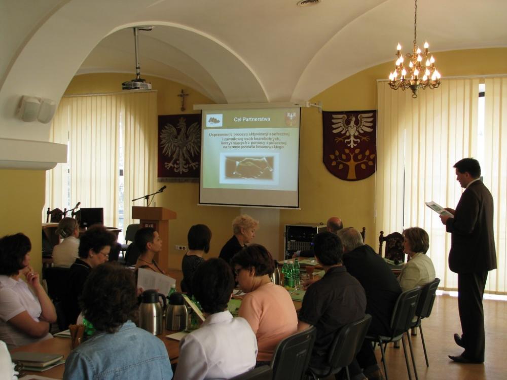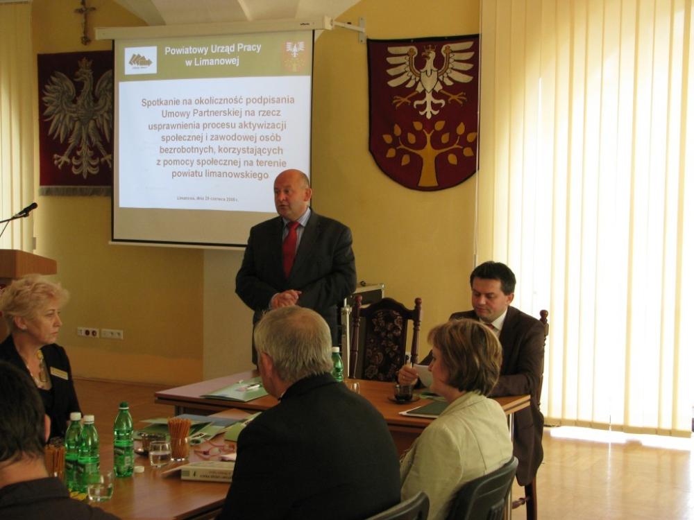 W dniu 29.06.2009 r. odbyło się spotkanie na okoliczność podpisania Umowy Partnerskiej na rzecz usprawnienia procesu aktywizacji społecznej i zawodowej osób bezrobotnych, korzystających z pomocy społecznej na terenie powiatu limanowskiego. W spotkaniu wzięli udział Starosta Limanowski Jan Puchała, przedstawiciele Powiatowego Urzędu Pacy, Powiatowego Centrum Pomocy Rodzinie w Limanowej oraz kierownicy i reprezentanci Miejskich i Gminnych Ośrodków Pomocy Społecznej z terenu powiatu limanowskiego.