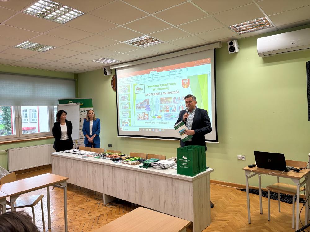 W dniu 24 września 2025 r. Dyrektor Powiatowego Urzędu Pracy w Limanowej Marek Młynarczyk wraz z doradcami zawodowymi: Ewą Matras i Agnieszką Bulanda spotkali się z młodzieżą oraz wychowawcami klas maturalnych techników Zespołu Szkół Nr 1 im. Józefa Piłsudskiego w Limanowej.