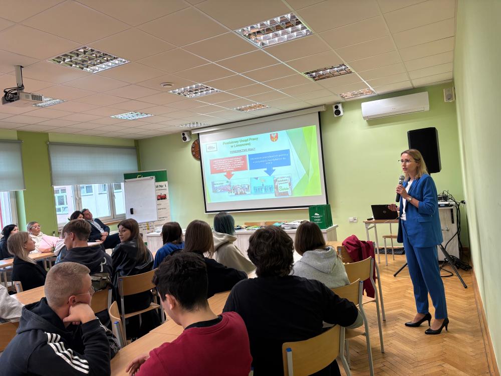 Dyrektor PUP powitał uczestników. Nadmienił młodzieży, że stoją obecnie na progu jednego z najważniejszych etapów w życiu – wyboru drogi, która zadecyduje o Ich przyszłości. Naturalnym jest, że niejednokrotnie może towarzyszyć Im niepewność w obliczu szybkich zmian jakie zachodzą w różnych obszarach życia. Jednym z największych wyzwań i zarazem szans, jakie przed Nimi stoją, jest rozwój sztucznej inteligencji. Jej wpływ na rynek pracy jest bardzo duży, bowiem automatyzuje część zadań, ale też tworzy zupełnie nowe zawody, które jeszcze kilka lat temu nie istniały. Dyrektor podkreśli uczniom, że największą wartością z uwagi na następujące szybkie zmiany, będzie zdolność uczenia się, elastyczność oraz kompetencje miękkie: krytyczne myślenie, kreatywność, praca zespołowa czy umiejętność szybkiego dostosowania się do nowych warunków. Zachęcił młodzież do inwestowania w siebie, rozwijania swoich pasji, bo właśnie one mogą stać się fundamentem przyszłej kariery. Nadmienił, aby nie bali się wyzwań, nowych kierunków studiów, kursów czy praktyk, bowiem każde doświadczenie to krok do przodu. Podkreślił, aby pamiętali, że w świecie, gdzie technologia zmienia się z dnia na dzień, najważniejsze jest, aby być ciekawym nowego, odważnym, „głodnym” wiedzy i otwartym na rozwój. Zaznaczył, że młode pokolenie nie tylko dostosowuje się do zmian, ale także je tworzy. Zaakcentował, że przyszłość należy do tych, którzy się nie zatrzymują, a młodzi będą tworzyć nowe rozwiązania i kształtować jutro. Dyrektor życzył uczniom odwagi, konsekwencji i wiary w siebie bowiem przyszłość należy do Nich. Zacytował słowa z wiersza Adama Asnyka „Do młodych”: Doradcy zawodowi przekazali młodzieży informacje dotyczące roli urzędów pracy oraz najważniejszych zmian w przepisach z zakresu rynku pracy, wynikających z wejścia w życie od 1 czerwca 2025 r. ustawy z dnia 20 marca 2025 r. o rynku pracy i służbach zatrudnienia. Omówili między innymi zasady rejestracji w urzędach pracy, naliczania zasiłku, cyfryzacji usług. Poinformowali o oferowanych przez PUP formach pomocy zgodnie z obowiązującymi przepisami. Omówili m. in. zatrudnienie subsydiowane, wspieranie przedsiębiorczości i tworzenia nowych stanowisk pracy, poradnictwo zawodowe, rozwój umiejętności i podnoszenie kwalifikacji, pośrednictwo pracy, w tym pośrednictwo w ramach sieci EURES. W trakcie spotkania wspomniano także o kampanii prowadzonej przez Ministerstwo Spraw Wewnętrznych i Administracji we współpracy ze Strażą Graniczną pn. „Zatrudnieni w NieWolę”, poruszającej problematykę zjawiska pracy przymusowej. Młodzież poznała zawody, na które istnieje zapotrzebowanie na lokalnym rynku pracy, na podstawie wyników badania Barometr Zawodów 2025.