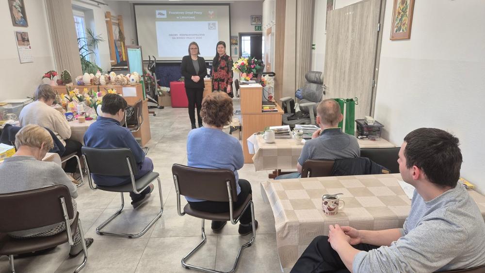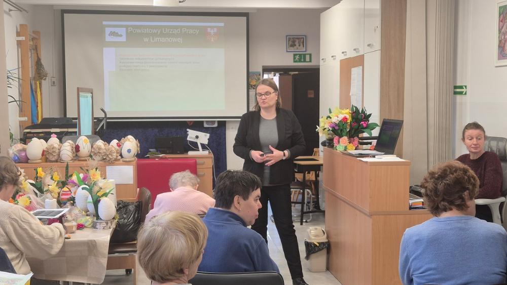 W dniu 23 marca 2026 r. Anna Wajda doradca zawodowy PUP Limanowa spotkała się z podopiecznymi i opiekunami Środowiskowego Domu Samopomocy w Limanowej. Podczas spotkania uczestnicy zostali zapoznani z formami aktywizacji zawodowej, adresowanymi do osób bezrobotnych i poszukujących pracy ze szczególnym uwzględnieniem osób z niepełnosprawnościami.